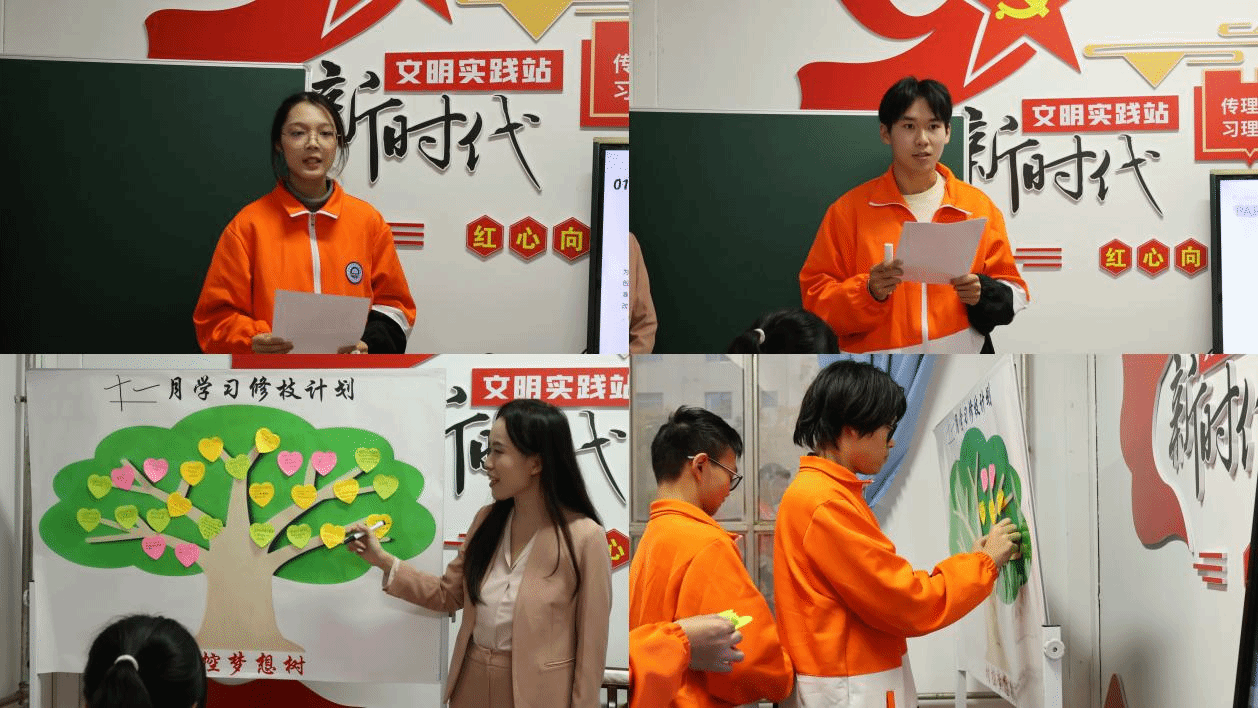 在榜样引领示范环节,国家励志奖学金获得者2024级张佳慧、学业优秀奖学金获得者2024级樊怡伶、国家奖学金获得者2022级杨慧分别从实用的学习方法、综合素质提升的技巧、制定合理的目标等多方面围绕自身经验进行真诚分享,引发了同学们高度认可与由衷赞同。在学风建设讨论与承诺环节,班级学习委员孔一凡首先总结了班级10月学风建设情况,随后围绕“班级11月学习目标”展开建议,并倡议全体同学共同签署学习承诺书。江河结合材料成型及控制工程专业特点,搭建“材控梦想树”,每位同学在便签纸上写下自己11月的奋斗目标,并贴到了“材控梦想树”上,现场交流氛围浓厚。