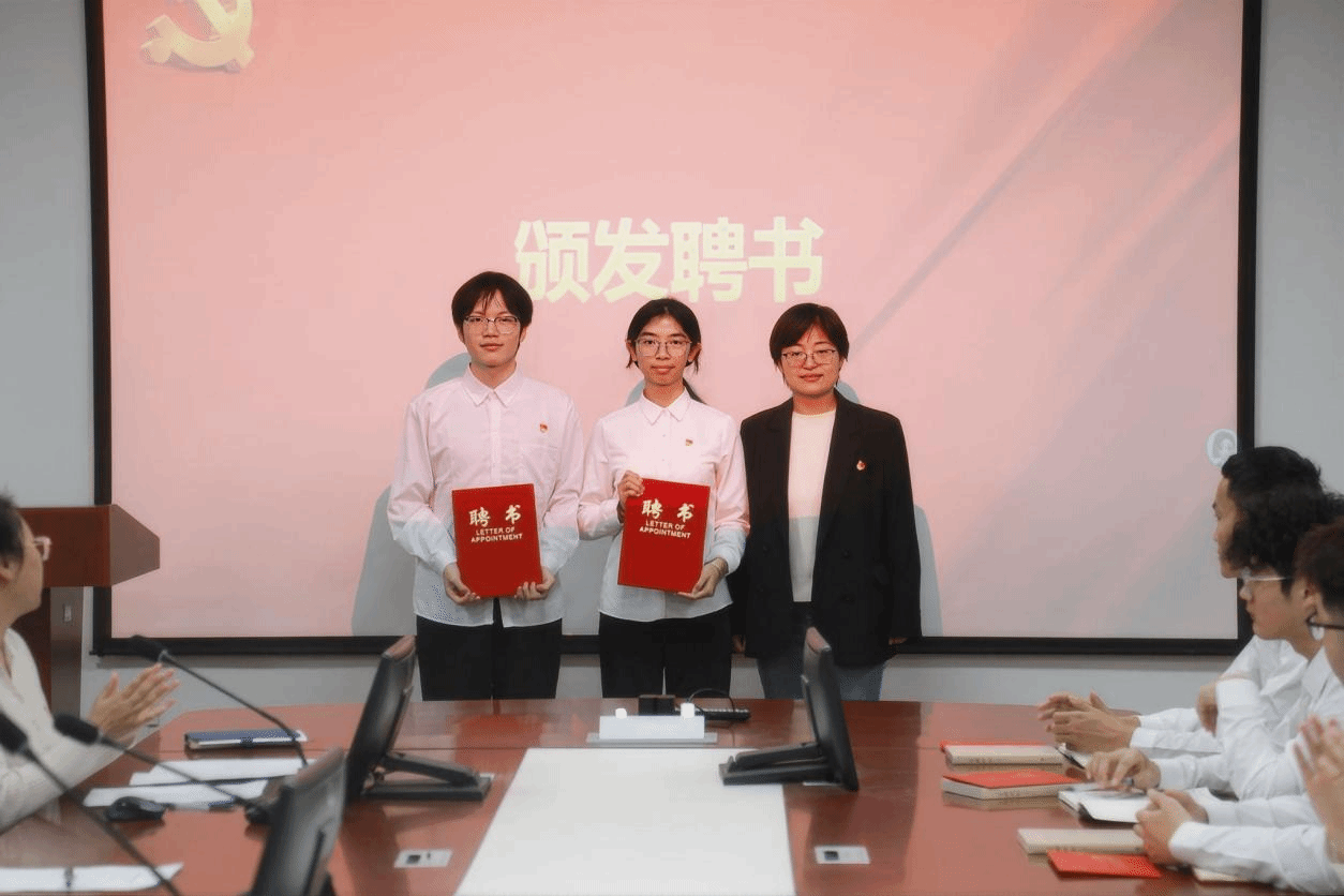 王兆婷宣读了新一届党建工作服务中心成员名单。姜磊、黄睿哲为学生党建工作服务中心成员颁发聘书。