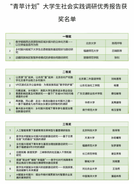 据悉,2024年12月,人民网携手高校发起“青苹计划”大学生社会实践调研活动。经过前期的调研选题征集,推出了11个具有较高研究价值和现实意义的选题类别,供全国大学生展开调研。调研报告征集活动于2025年4月24日开始,截至9月1日,共收到有效调研报告357篇。全国28个省(区、市)的188所高校的学生参加了征集活动。2025年10月至12月,人民网研究院邀请“青苹计划”启动高校、人社部、人民日报社、光明日报社、中国大学生在线及人民网的评委进行了通讯评审、评审委员会审议,选出了15篇优秀报告并进行了公示,其中一等奖3篇,二等奖5篇,三等奖7篇。